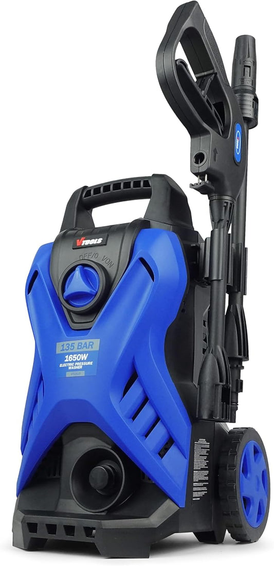 VTOOLS 135 Bar Electric Pressure Washer With 2 Wheels,5 Meter Hose & Soap Dispenser, 1650 Watt,Copper Motor,Auto Stop and Self Priming Mode, For Car, Home & Garden, Blue, VT1510