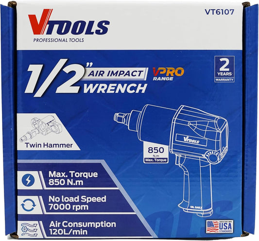 VTOOLS VT6107 Air Impact Wrench 1/2 Inch, Max Torque 850Nm, Up to 7000RPM, Twin Hammer, Lightweight, Heavy Duty Impact Gun for Auto Repair, Changing Tires and Automobile, 2 Years Warranty, blue,
