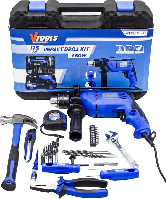 VTOOLS VT1206-KIT 115 Piece 650-Watt Impact Drill Driver & Home Tool Set, DIY Hand Tool Kits For Home, Office, Garden, Portable Storage Case, 2 Years Warranty